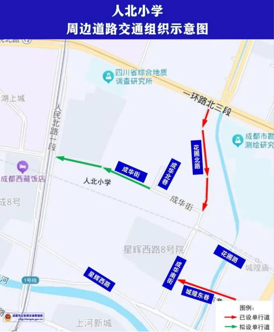二、2025年10月20日起,工作日每天17:00-17:40(寒暑假期除外)对金牛区人北小学周边的成华街(成华北巷至人民北路)实施机动车由东向西单向通行的交通管理措施。受限机动车可通过星辉西路、成华南街、人民北路一段等道路绕行。