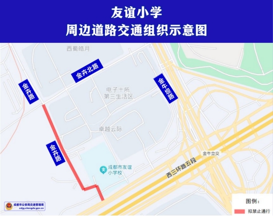 四、2025年10月20日起,工作日每天7:50-8:20;17:20-17:50(寒暑假期除外)对金牛区友谊小学周边的金卉路(金卉北路至三环路辅道)实施禁止机动车通行的交通管理措施。受限机动车可通过金卉北路、金牛坝路、金瑞路、蜀跃路等道路绕行。