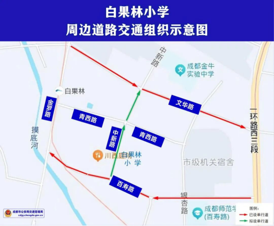 三、2025年10月20日起,工作日每天17:20-17:50(寒暑假期除外)对金牛区白果林小学周边的中新路(百寿路至文华路)实施机动车由南向北单向通行的交通管理措施。受限机动车可通过百寿路、文华路、金罗路、青西路、银杏路等道路绕行。