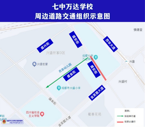 七、2025年10月20日起,工作日每天16:30-18:00(寒暑假期除外)对金牛区成都七中万达学校周边的盛安街(盛金路至金芙蓉大道)实施禁止机动车通行的交通管理措施;工作日每天8:00-8:30,16:30-18:00(寒暑假期除外)盛金路(盛安街至盛发街)实施机动车由北向南单向通行的交通管理措施。受限机动车可通过金芙蓉大道、西华大道、盛发街、盛兴路等道路绕行。
