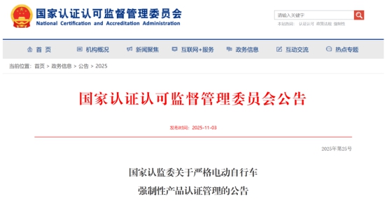 根据《中华人民共和国认证认可条例》和《工业和信息化部 公安部 市场监管总局 国家消防救援局关于强化电动自行车强制性国家标准实施 加快新产品供应的意见》(工信部联消费〔2025〕144号)关于“2025年8月31日及之前出厂或者进口的不符合《电动自行车安全技术规范》(GB17761—2024)但符合旧版本标准的产品可以销售至2025年11月30日”的要求,为严格电动自行车强制性产品认证(CCC认证)管理,现将有关事项公告如下: