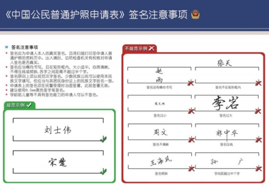 签名应当横向书写,且须在《中国公民普通护照申请表》指定的矩形框内,不得压线或倾斜,各字之间距离不超过半个字。