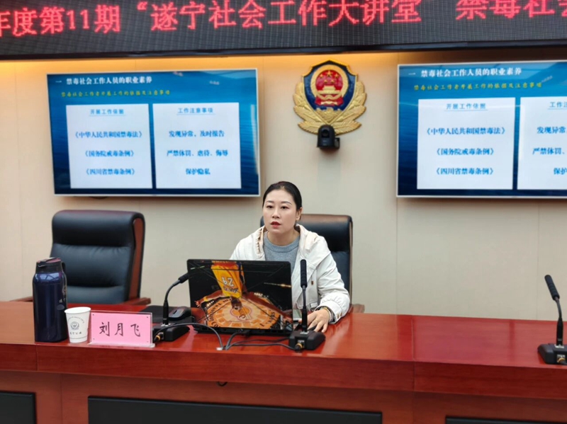 在90分钟的“禁毒社工工作大讲堂”中,刘月飞老师结合基层禁毒工作实际,系统阐述了禁毒社会工作的专业内涵和实践路径,从法律依据、实务技巧、典型案例等方面详细讲解了吸毒人员服务管理、帮扶救助的策略与技巧。课程内容系统全面,方法务实管用,为全体学员拓宽了视野、启发了思路,也为遂宁禁毒社会工作提供了宝贵的经验借鉴。