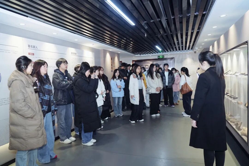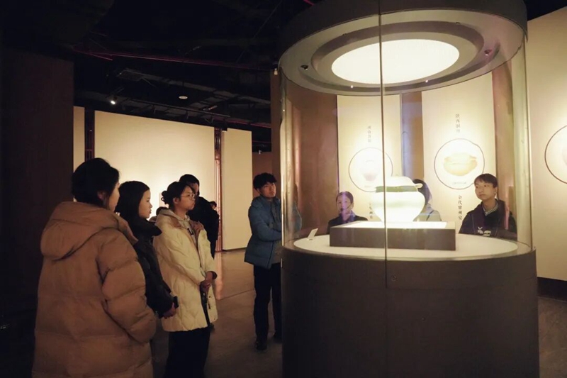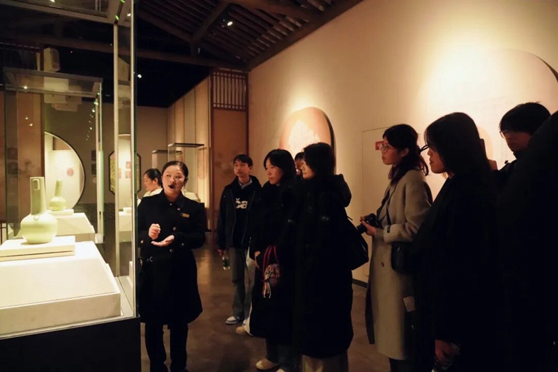 在讲解员带领下,同学们步入以南宋青釉鼓腹瓶为灵感的场馆。馆内文物尽显宋代制瓷巅峰水准,大家触摸历史温度,感受古代工匠的极致审美,体悟中华传统文化的传承力量,在宋瓷的温润光泽中感受中华文脉的绵延不绝。