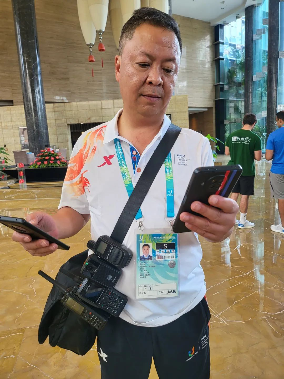作为安保点位负责人,4台对讲机、两部手机和两部充电宝已经成为刘志军每日必不可少的“战斗装备”。从早上6点到晚上12点,随时可以在酒店大厅看到刘志军忙碌的身影,或是检查安检设备,或是手持对讲机与各方沟通。每一天,他身上总是背着十余斤的工作资料和设备穿梭在酒店每一个点位,至少两万步的运动记录是他工作量最基础的体现。每天凌晨,当所有赛事相关人员安全回到酒店后,他才可以卸下满身的辎重和疲惫,回到房间泡一泡因长时间站立而浮肿的双脚。