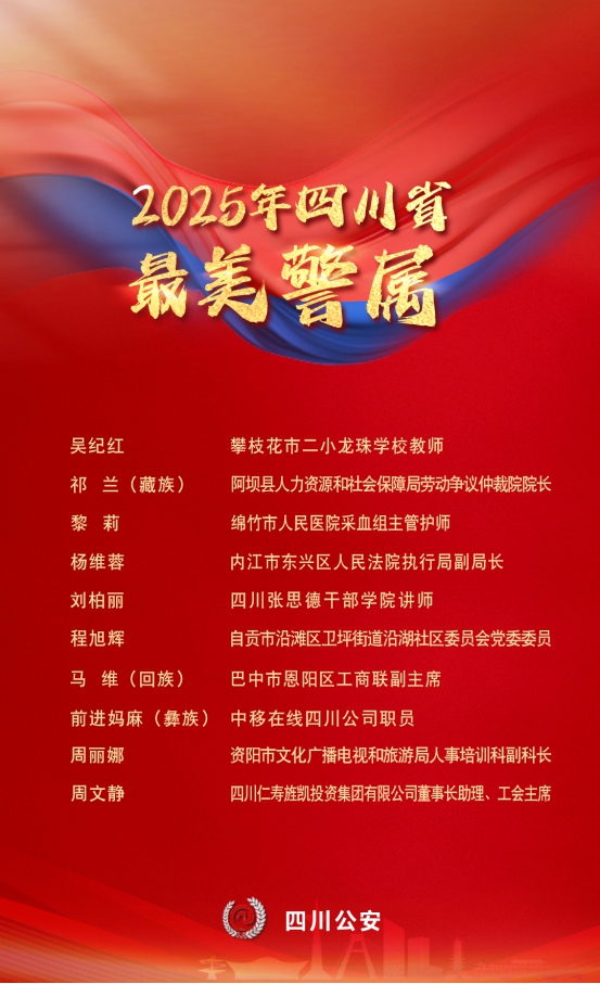 根据2025年四川省“最美基层民警、最美警属”学习宣传活动安排,各市(州)党委宣传部、公安局精心组织策划,深入宣传展示,严格审核推荐,集中宣传选树了一批奋战在公安一线,严格规范公正文明执法,在法治公安建设中勇于担当作为的优秀基层民警,宣传选树了一批涵养家庭美德、勇挑家庭重担的优秀警属。经过多轮推荐和评审,中共四川省委宣传部、四川省公安厅决定授予吉木子呷、梅伊、王鹏、罗慧琳、李文燕、向三仟、冷柏林、唐娟、王月、马廷良等10名同志2025年四川省“最美基层民警”称号,授予吴纪红、祁兰、黎莉、杨维蓉、刘柏丽、程旭辉、马维、前进妈麻、周丽娜、周文静等10人2025年四川省“最美警属”称号。