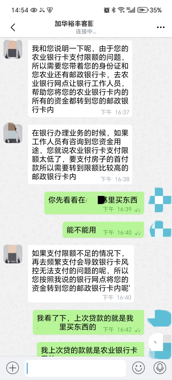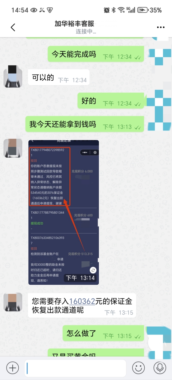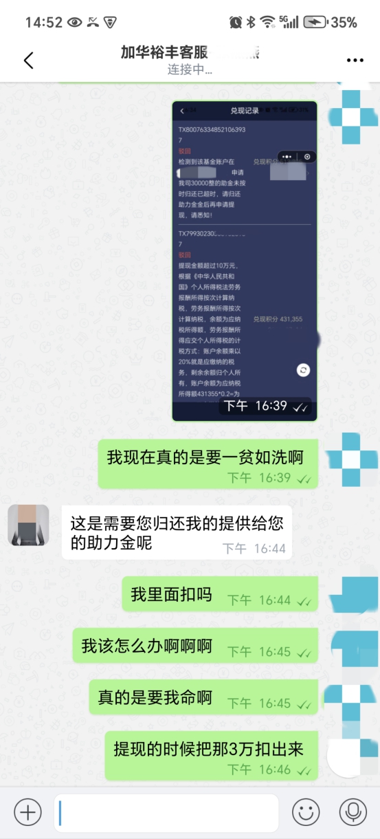 杨先生扫码后,页面跳转至名为“加华裕丰”的线上平台,平台“客服”引导其下载该平台APP。随后,APP内“客服”主动联系杨先生,表示可通过“清退用户数据登记系统”为他办理退款,金额为1600元,但需以购买基金的方式进行操作,对方声称如此不仅能拿回本金,还可获得额外返利。