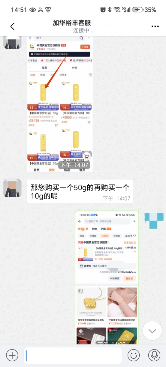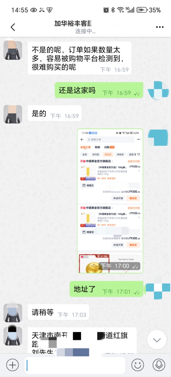 为挽回前期投入,杨先生遂通过某电商平台购买了价值4万元的黄金,寄往对方指定地址。值得注意的是,在此过程中,黄金商家曾提醒杨先生,其提供的收件人电话疑似涉及诈骗,但“客服”以“受国家金融局监管”为由辩解,再次打消了杨先生的疑虑。