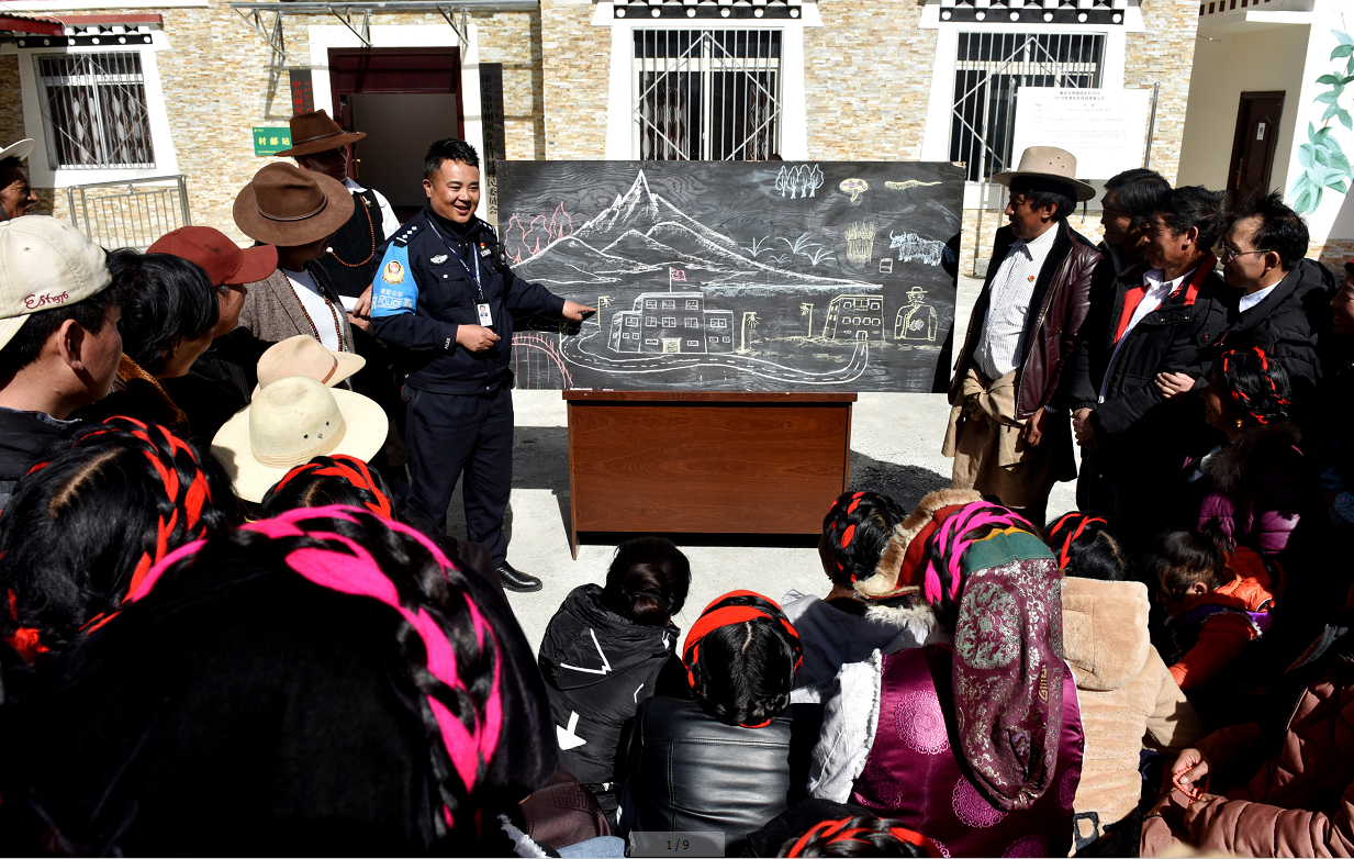 扎日村的地貌、牧场、民居,卡通农牧民形象,萌萌哒的牦牛、虫草、青稞、蔬菜、野山菌在巴桑呷瓦的黑板上被勾勒出来,他用形象的白描绘画和诙谐生动的言语,宣讲党的政策和国家法律法规,为农牧民细算脱贫致富的“明白账”。