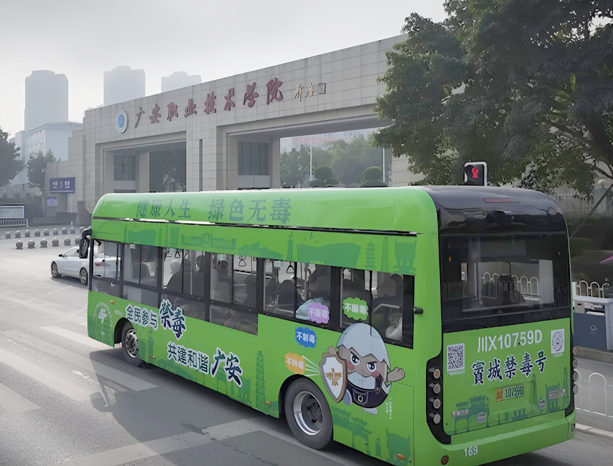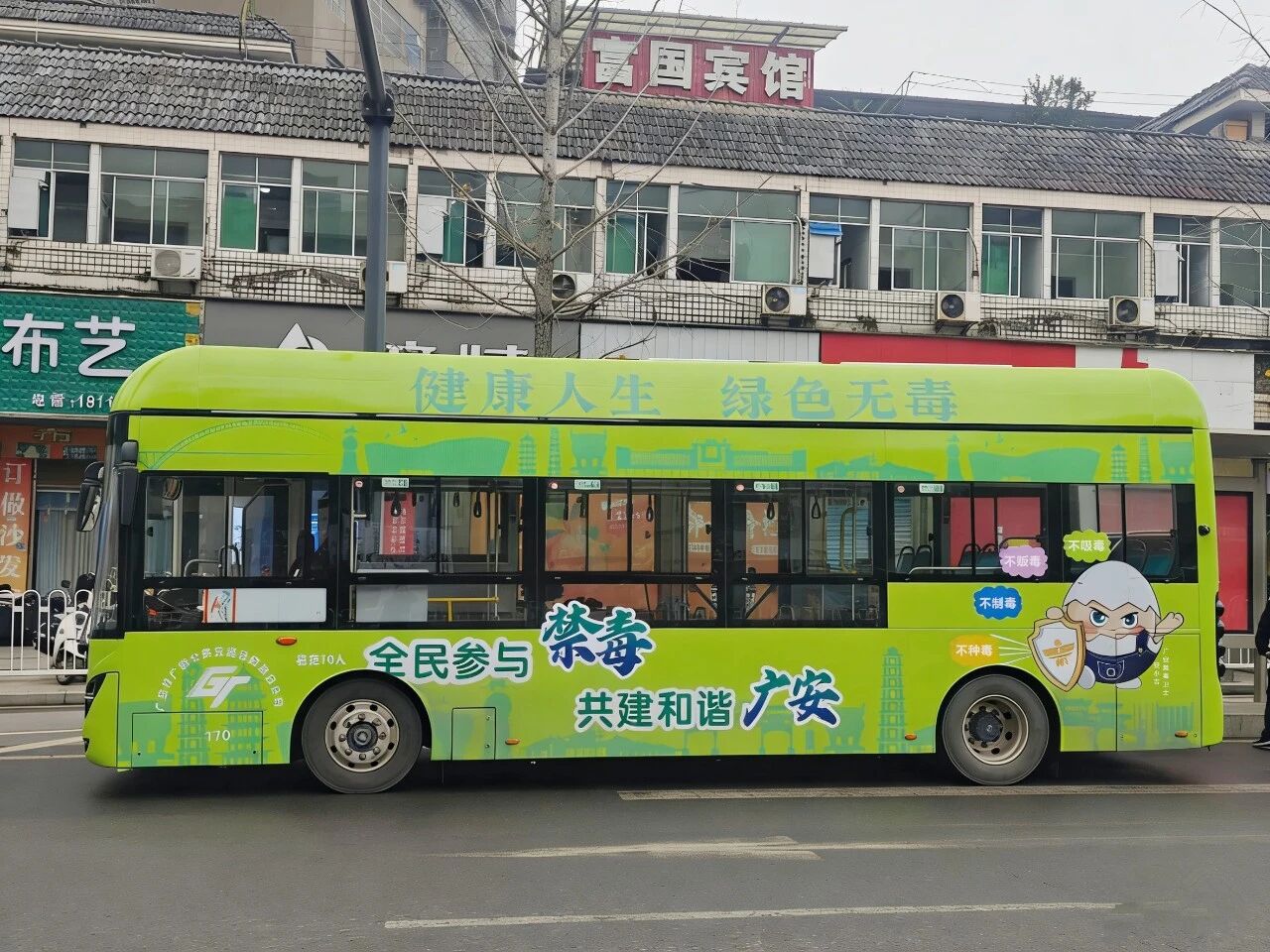 近日,由广安市禁毒办联合广安运安运业有限责任公司倾力打造的“賨城禁毒号”禁毒主题公交正式投入运行。3辆车身印有“全民参与禁毒,共建和谐广安”醒目口号的绿色公交车,穿梭在城市的大街小巷,成为一道亮丽的风景线,开启广安禁毒宣传“流动课堂”新模式。