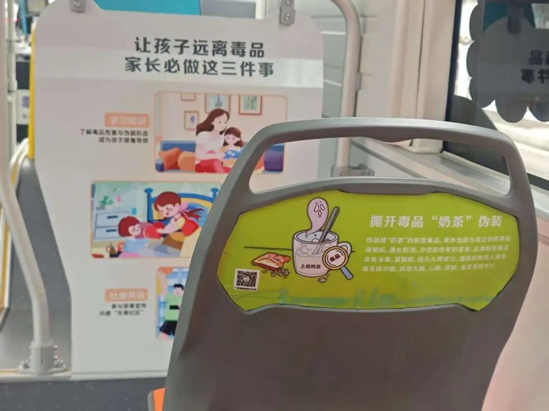踏上“賨城禁毒号”,浓厚的禁毒氛围便扑面而来,座椅靠背变身“科普展板”,图文并茂地揭秘新型毒品的伪装与危害。